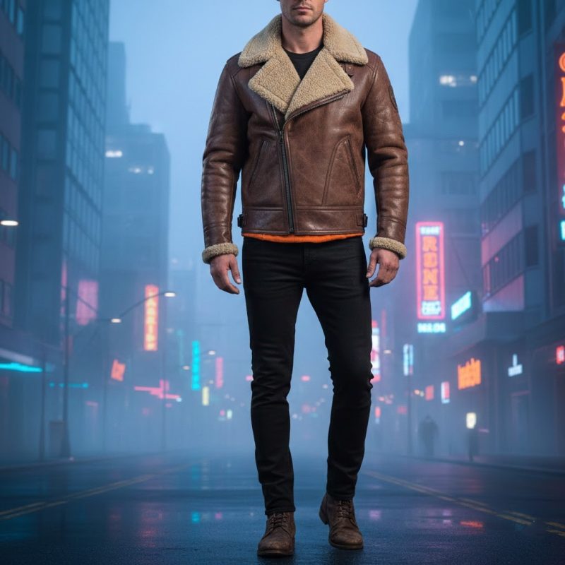 Ryan Gosling redefined sci-fi fashion when he wore that stunning shearling jacket in Blade Runner 2049. The coat became an instant icon among movie lovers and style enthusiasts worldwide. This piece isn’t just movie memorabilia. It’s a versatile wardrobe essential that elevates any outfit instantly. The jacket’s distinctive brown shearling collar and orange interior lining […]